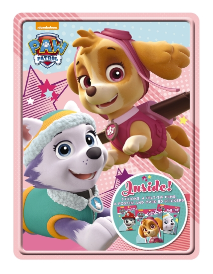 The Paw Patrol team of fun puppy heroes with high-tech gadgets and cool cars will take you on exciting rescue missions. This cool tin is a great gift idea for Paw Patrol fans. It includes a storybook, an activity book, a colouring book, 50 stickers, a double-sided poster and four felt-tip pens.