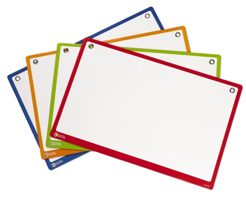 Set of four innovative write-and-wipe boards in four colours. Large 280mm x 432mm writing surface. Magnet on the back to easily rearrange and display work on a larger magnetic surface such as an interactive whiteboard. Includes strong, durable grommets for hanging.