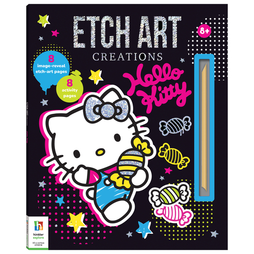 Reveal a world of rainbows and smiles with Etch Art Creations Hello Kitty! This book includes activities and colour-reveal panels, all featuring Hello Kitty. Draw on the etch-art pages with the wooden stylus to uncover colourful art, then complete the fun activities like word search and spot the difference. Perfect for avid fans of any age! Includes 8 colour-reveal scratch pages, 8 activity pages & a wooden scratching tool!